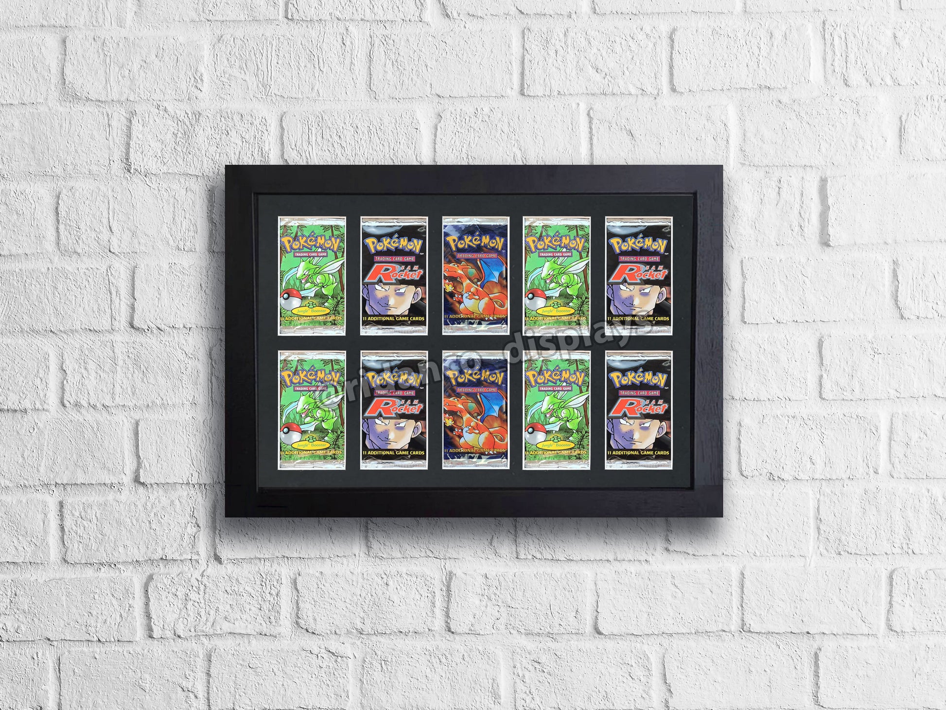 This listing is for a black solid wood frame with a brushed finish, and matching black mount for that timeless professional look. The mount has a bevelled white edge to frame the window through which the pack artwork can be seen. Depending on the size of the pack, occasionally the crimps can be seen, as shown with the additional image showing a vintage Pokemon Gym Heroes booster pack.