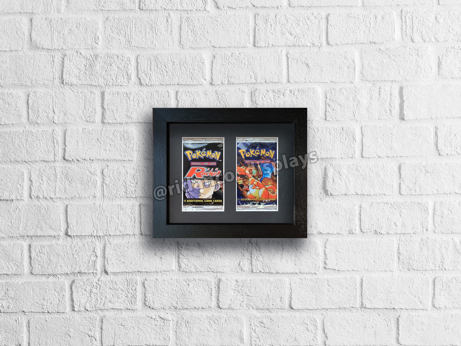 This listing is for a black solid wood frame with a brushed finish, and matching black mount for that timeless professional look. The mount has a bevelled white edge to frame the window through which the pack artwork can be seen. Depending on the size of the pack, occasionally the crimps can be seen, as shown with the additional image showing a vintage Pokemon Gym Heroes booster pack.