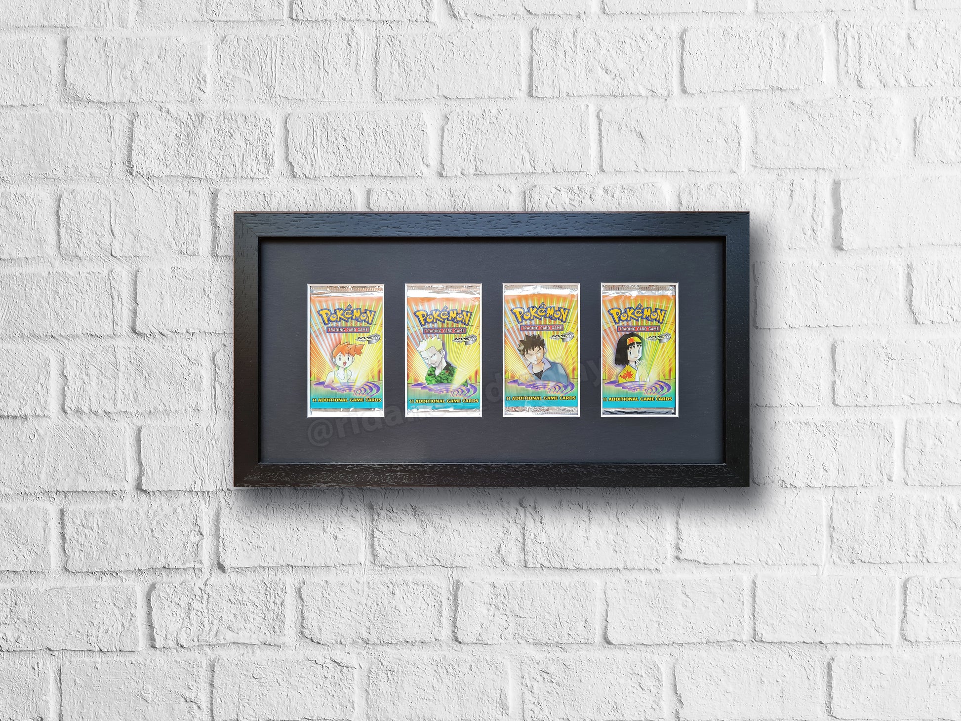 This listing is for a black solid wood frame with a brushed finish, and matching black mount for that timeless professional look. The mount has a bevelled white edge to frame the window through which the pack artwork can be seen. Depending on the size of the pack, occasionally the crimps can be seen, as shown with the additional image showing a vintage Pokemon Gym Heroes booster pack.
