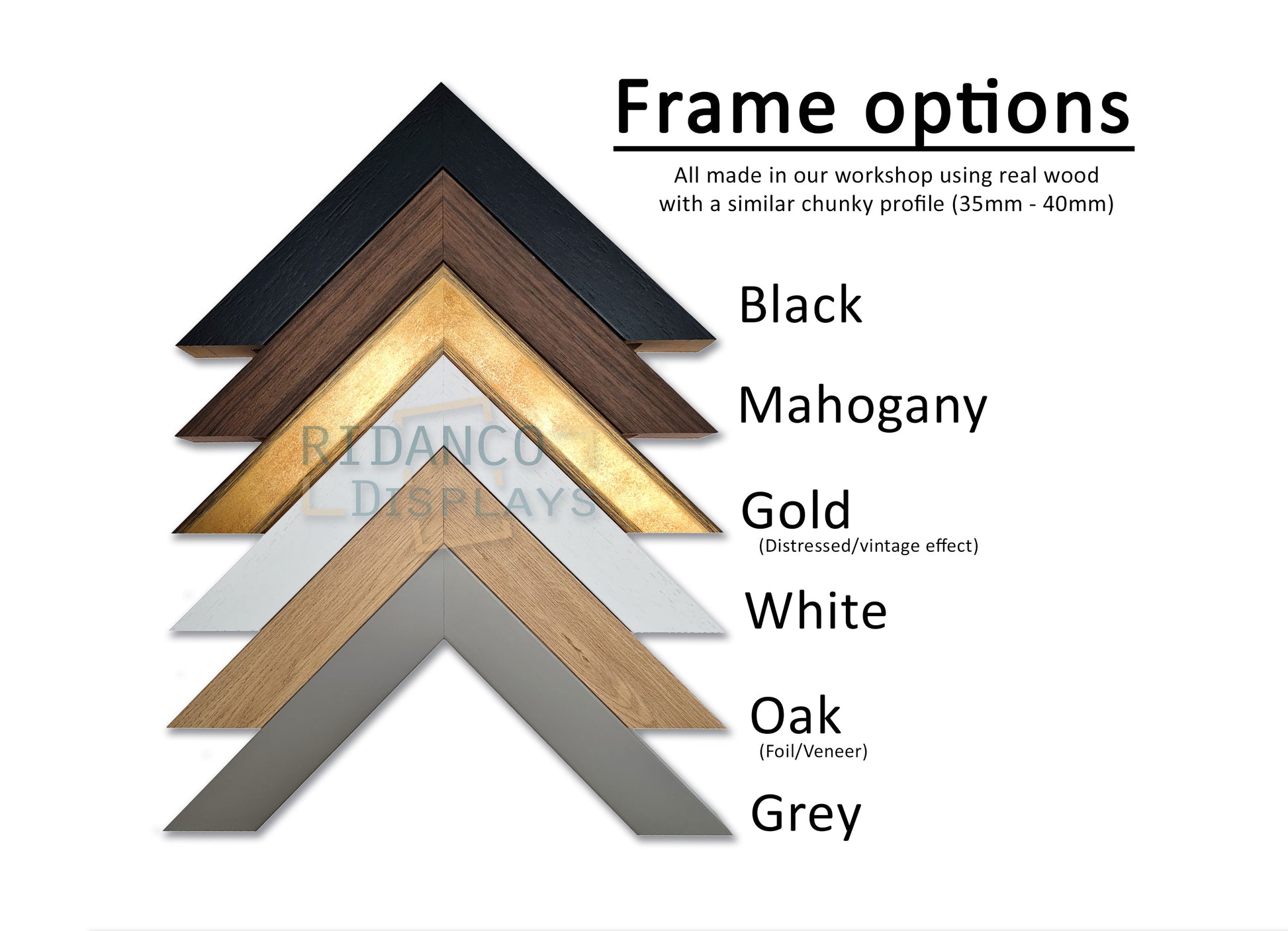 Made to order with foam to hold your slabs in position, behind an attractive printed and bevelled cut mountboard, and premium acrylic sheeting with 99.7% UV protection and high clarity. Our chunky solid wood frames are professionally mitred and underpinned in the corners for strength. For these printed mounts, we include a second complete print behind to use as an immersive backing.